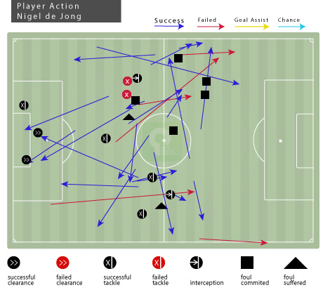 Belanda memang rela-rela saja menyerah dalam penguasaan bola demi menjaga kekompakan bentuk lini tengah mereka. Di sana ada sang jangkar, Nigel de Jong, yang berperan besar dalam kedisiplinan lini tengah Tim Oranye. Ia berhasil membuat beberapa tekel krusial.