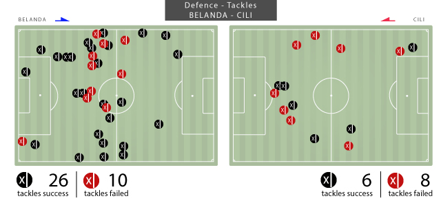 Seperti yang telah disampaikan di atas, peran Aranguiz dan Diaz yang menjadi kunci lini tengah Chile juga hanya sampai pada jumlah operan dan penguasaan bola saja. Hal itu terjadi karena penetrasi mereka seringkali datang dari area sayap, sedangkan kali ini Belanda memaksa wing back mereka untuk tidak dibiarkan mampu mengeluarkan performa seperti pada dua pertandingan sebelumnya.