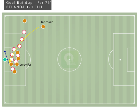 Lalu, kemudian masuknya Leroy Fer juga membuat lini tengah Belanda menjadi lebih cair setelah sebelumnya dibuat padat dengan kekauan de Jong dan Sneijder. Benar saja, dalam waktu 90 detik setelah ia masuk ke lapangan, pemain Norwich City tersebut mampu menyambut bola set piece yang merupakan sentuhan keduanya dalam pertandingan itu, membuat Belanda unggul 1-0.