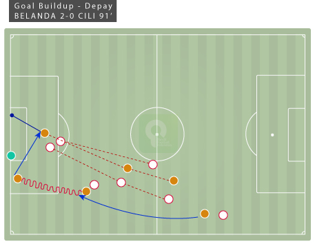 Kemudian di injury time, Belanda mencetak gol kedua dengan serangan balik cepat yang berasal dari area defensif Chile. Diawali Robben yang jauh berlari menggiring bola, Depay membuntuti Robben kemudian mencari ruang untuk mencetak gol dari jarak dekat.