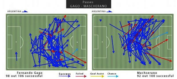 Higuain, Aguero dan Di Maria sama sekali tak berkutik membongkar pertahanan Iran yang bermain rapat dan menunggu di dalam kotak penalti. Sikap Iran inilah yang bisa mendorong Fernando Gago dan Mascherano jauh naik ke depan. Tercatat mereka berdua mampu membuat 100 passing lebih yang dilakukan pada pertandingan itu.
