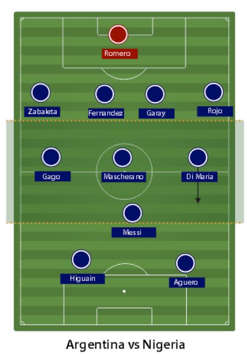 Taktik Sabella dalam memaksa Nigeria untuk menurunkan garis pertahanan βlewat Higuain dan Aguero yang bermain tinggiβcukup sukses mengalihkan penjagaan pada Messi. Akibatnya, pemain berusia 26 tahun ini bebas menusuk dari lini tengah untuk menyambut umpan silang, bola rebound, atau bola-bola cut-back.