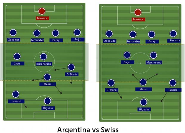 Pada laga babak 16 besar menghadapi Swiss, Sabella menyiasatinya dengan membuat Argentina bertranformasi menjadi 4-4-2 dengan membiarkan Lavezzi turun ke tengah dan Messi naik ke depan. Atau sebalinya, Messi yang mundur ke tengah dan Di Maria dimainkan melebar tapi sejajar dengan Lavezzi dan Higuain.