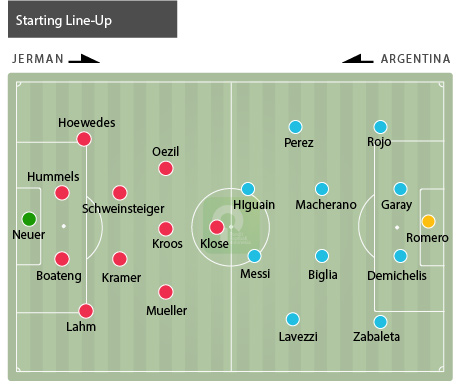Sekitar setengah jam sebelum kick-off, Jerman telah mengeluarkan susunan pemain yang akan turun menjadi starting XI. Tak ada perubahan mencolok yang dilakukan Loew: Neuer pada posisi penjaga gawang, Lahm kembali menjadi fullback kanan menemani Boateng-Hummels-Hoewedes di lini pertahanan, Schweinsteiger-Khedira-Kroos di lini tengah, dan Mueller-Klose-Oezil di lini depan. Susunan pemain yang sama dengan yang berlaga di semi-final melawan Brasil, Selasa lalu.