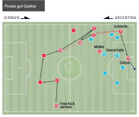 Gol bersejarah ini mungkin tidak akan terjadi andai Mueller tidak bergerak turun beberapa langkah. Gerakan itu berhasil menarik Demichelis naik ke atas beberapa langkah saja, tapi itu sudah cukup memberi ruang yang dibutuhkan oleh Goetze untuk bisa leluasa menahan bola dengan dada dan mengakhirinya dengan tendangan voli.