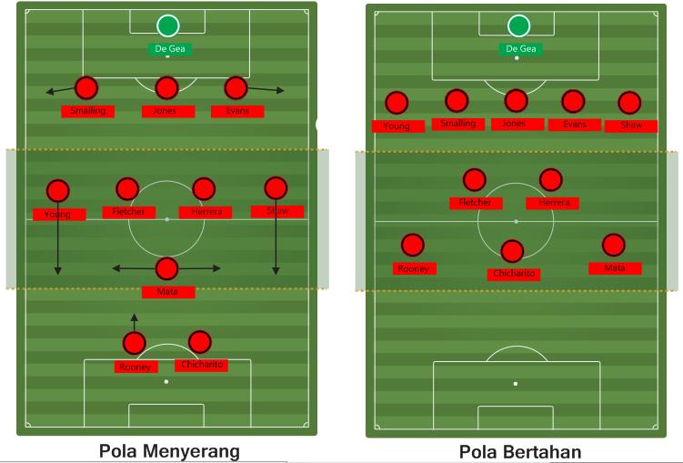 Di lini tengah, satu tempat di posisi wingback akan ditempati Young. Kemudian Ander Herrera akan ditemani Darren Fletcher sebagai double pivot. Sementara itu, Mata ditempatkan sebagai gelandang serang di belakang dua penyerang, Wayne Rooney dan Danny Welbeck.