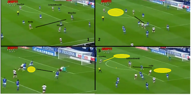 [Proses gol pertama Bayern. Terlihat bagaimana Goetze membuka ruang dan mengalihkan konsentrasi bek Schalke untuk menjaga Lewandowski]