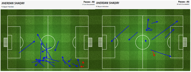 [Kiri: Umpan Shaqiri 33 menit sebelum Goetze keluar. Kanan: Umpan Shaqiri 33 menit setelah Goetze keluar]