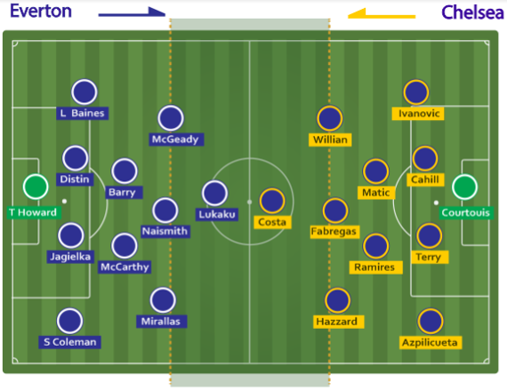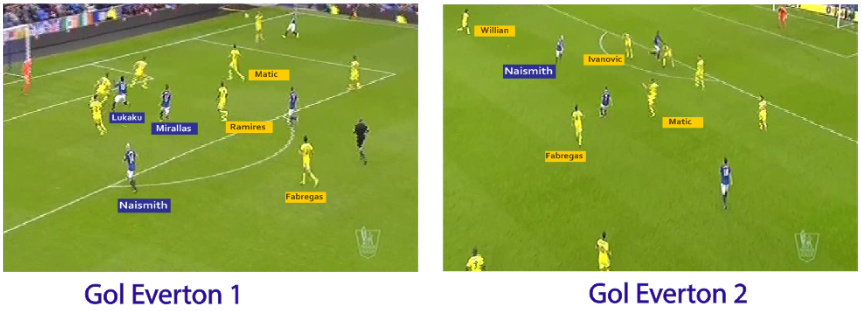 Lantas kecenderungan Everton yang memaksimalkan sayap, membuat pola backfour mereka cenderung melebar dengan menarik dua fullback yakni Leighton Baines dan Seamus Coleman bermain di garis tepian. Kerenggangan inilah yang dilihat Diego Costa yang berlari diagonal. Kecerdasan dan kemampuan Fabregas memberikan throughball mempermudah Chelsea memecah pertahanan Everton. Gol pertama pun tercipta.