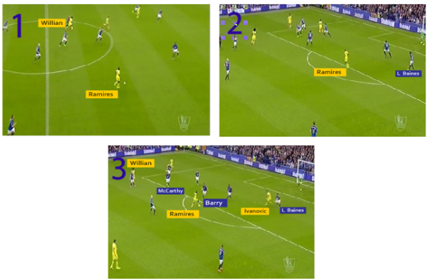 Masalah lainnya adalah malasnya tiga gelandang serang Everton yakni Aiden McGeady, Steven Naismith dan Mirallas untuk membantu pertahanan. Lihat gambar no 2, bagaimana dengan leluasa Ramires berada di depan kotak penalti Everton tanpa penjagaan siapapun.