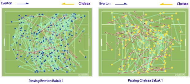 Selepas dua gol yang bersarang di gawang Tim Howard, Chelsea bermain lebih bersabar dan membuat Everton bisa berlama-lama menguasai bola. Mou pun terlihat mengintruksikan anak asuhnya memainkan garis pertahanan yang dalam. Kondisi inilah yang membuat Everton kesulitan menembus final third Chelsea.