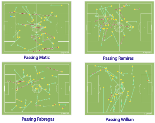 Namun ada yang terlihat taktik baru Mou di laga ini. Yakni disposisi diantara empat gelandang yaitu Fabregas, Willian, Matic dan Ramires. Keempat pemain ini seringkali menempati posisi yang acak. Bergerak ke kanan, kiri atau tengah. [lihat grafis passing di atas]