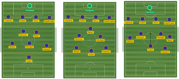 Dengan mendorong Fabregas lebih maju, tugas untuk menemani Matic diberikan pada Ramires. Rotasi menarik terjadi di lini tengah. Mou lebih memilih Willian ketimbang Schurrle. Hal ini dilakukan mengingat Schurrle buruk dalam bertahan.
