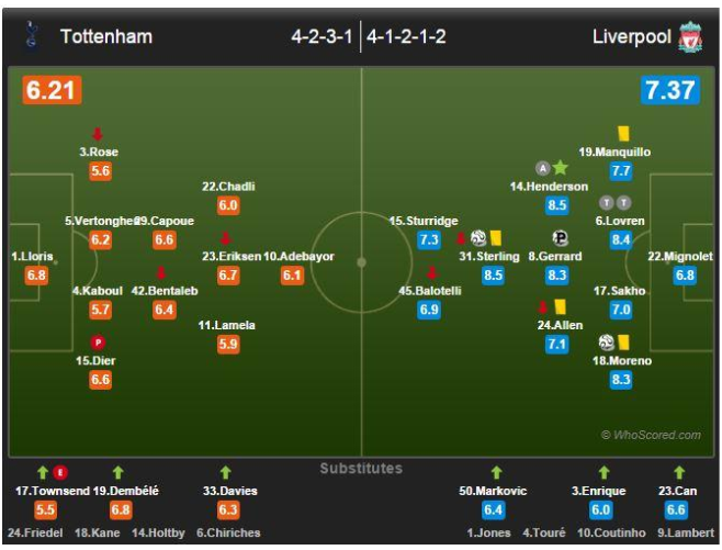 Sisi kiri Liverpool menjadi pertarungan yang menarik dalam pertandingan kali ini. Pada pos inilah terjadi duel antara Alberto Moreno, bek kiri Liverpool, dan Eric Dier dari Spurs. Ini duel dua pemain yang sama-sama baru bermain di Liga Inggris musim ini. Moreno dibeli dari Sevilla, Dier dari Sporting Lisbon.