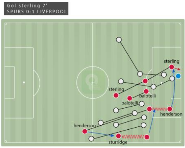 Seperti halnya gol pertama, dimana Sturridge yang melebar memberi umpan ke Henderson sebelum mengirimkannya menjadi assist ke Sterling. Dari sini setidaknya ada beberapa peran yang dapat terlihat. Yaitu Balotelli sebagai decoy (pancingan) sekaligus targetman, Sterling masuk dari lini kedua dan Sturridge pembuka ruang.