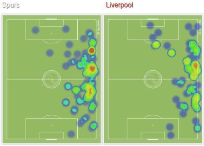 Namun ketika memperhatikan grafis heatmap di atas, Moreno sebenarnya memiliki kecenderungan lebih disiplin dalam menjaga daerah tanggung jawabnya. Hanya sedikit aksinya yang dilakukan hingga daerah sepertiga akhir lawan. Berbeda dengan Eric Dier yang lebih aktif untuk membantu serangan.