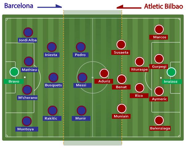 Pada laga ini Garcia meninggalkan Alves dan memilih Martin Montoya pada posisi fullback kanan. Hal ini bukan tanpa alasan. Montoya adalah fullback yang memiliki kemampuan tekel, merebut bola, dan adu fisik yang cukup bagus. Kehadiran Montoya cukup mematikan permainan gelandang serang Bilbao yang naik daun yakni Iker Muniain