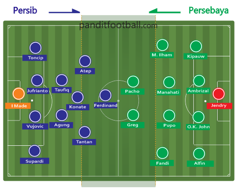 Keputusan ini ternyata sangat efektif mematikan serangan Persebaya. Apalagi dengan Isaac Pupo yang difungsikan sebagai pengatur serangan Persebaya ditempatkan di tengah, bola sering bergulir di sekitar wilayah kekuasaan duo gelandang bertahan Persib, Agung dan Taufiq.
