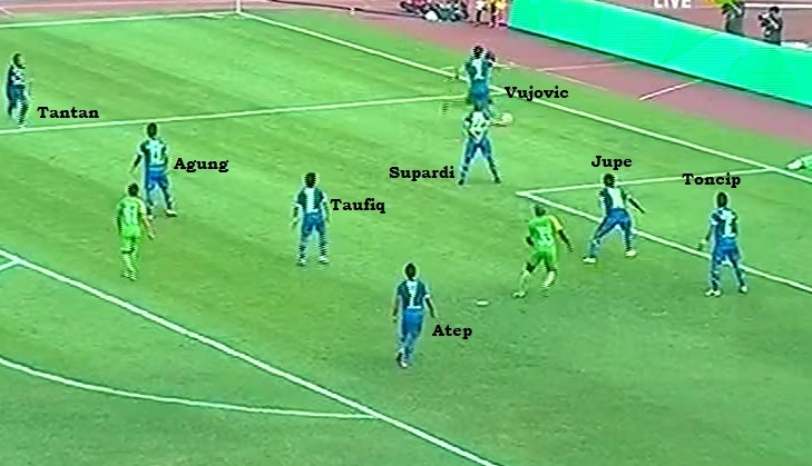 Dua pemain ini juga dengan baik, secara bergantian, mengalirkan bola ke kanan atau kiri, ke depan atau kadang juga ke belakang. Agung dan Taufik sangat sabar dalam men-delay permainan. Keduanya menjadi aktor kunci dari cara bermain Persib kemarin.