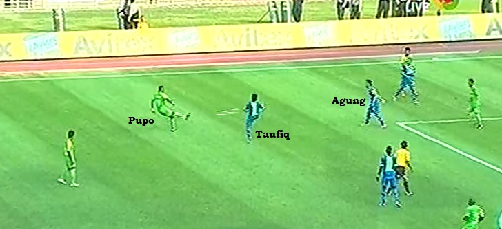 Taufik dan Agung dengan sangat disiplin dan rapi mengendalikan ruang di depan garis pertahanan. Mereka main dengan cara yang sungguh terukur, jarang "mengambil sekali", sesekali saja mereka dengan cepat langsung berduel untuk merebut bola. Lebih sering mereka melakukan zonal marking di lini tengah.