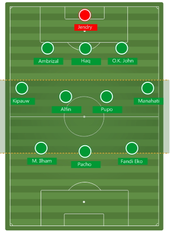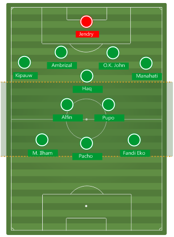 Perubahan posisi dialami beberapa pemain lain. Alfin Tuasalamony bermain sebagai gelandang bertahan, Manahati Lestusen ditempatkan sebagai wingback kiri, dan Hasyim Kipauw didorong ke depan untuk menjadi wingback kanan. Sementara Fandi Eko dan M. Ilham, mengapit Emmanuele βPachoβ Kenmogne yang menjadi penyerang tengah.