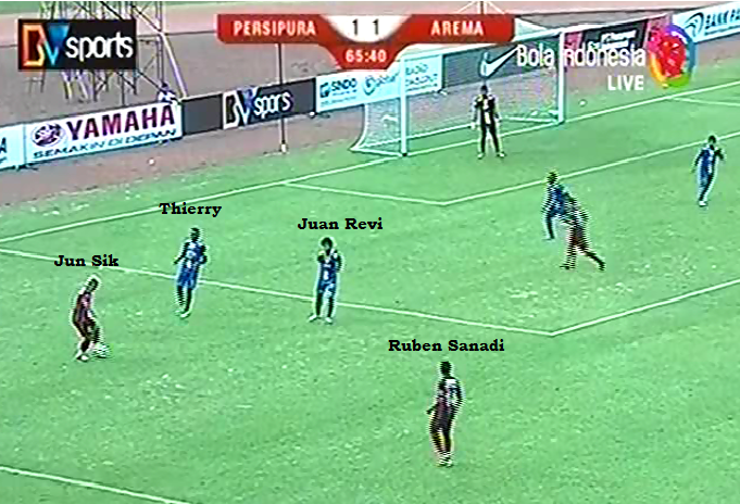 Karena menerapkan pressing, keduanya memang sering terpancing naik untuk menjegal duo fullback Persipura, Ruben Sanadi dan Yustinus Pae, yang aktif membantu lini penyerangan. Dan para pemain Persipura yang menguasai bola memanfaatkan situasi ini dengan memberikan umpan-umpan terobosan pada kedua flank.
