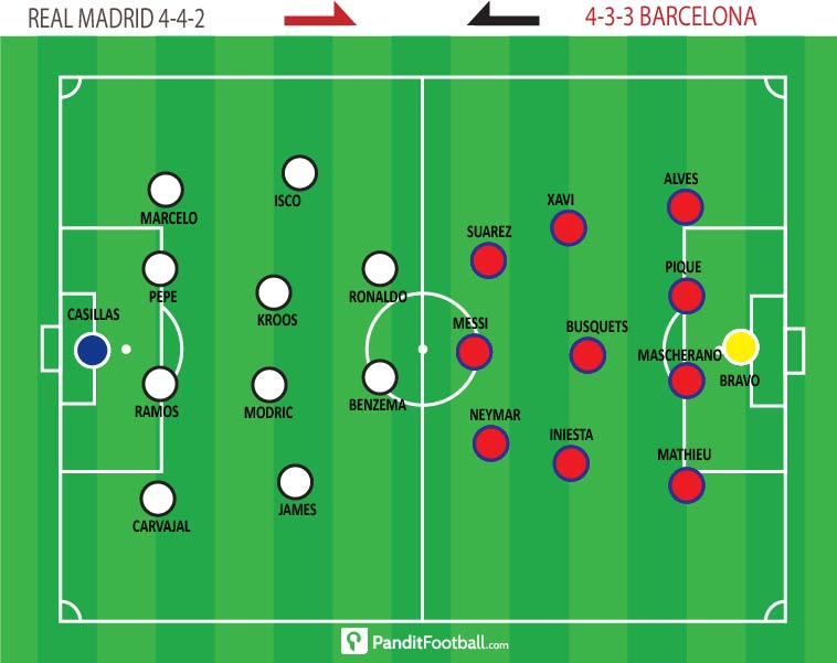 Madrid menumpuk pemainnya di sayap. Sayap kiri oleh Marcelo, Isco, dan Ronaldo, sementara sayap kanan Carvajal dan James. Sangat riskan bagi Madrid terus-terusan melakukan skema seperti ini. Beruntung, Barca tidak menambah keunggulah, meski dua sisi pertahanan Madrid menjadi begitu ringkih.
