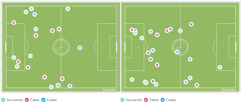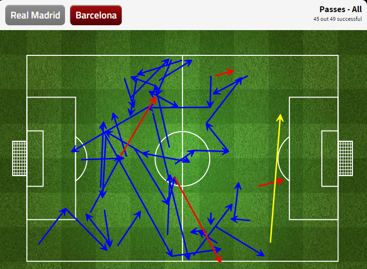 Dari statistik ini terlihat saat bertahan, Madrid menumpuk pemainnya di area kotak penalti. Sementara itu kedua sisi seolah terabaikan. Untungnya, Barca tak memanfaatkan celah tersebut untuk membombardir pertahanan Madrid.