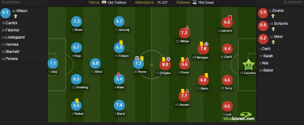 Bahkan sebagai bonus, pertahanan Chelsea menyisakan van Persie juga pada posisi yang tak terjaga. Hal ini berbuah manis bagi United setelah Fellaini benar-benar bisa menanduk bola, dan bola muntahannya pun berhasil dimanfaatkan oleh van Persie tanpa penjagaan yang berarti.