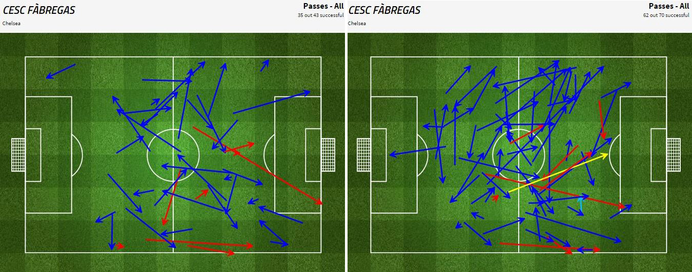 Perbandingan grafik operan Fabregas saat melawan Manchester United (kiri) dan Arsenal (kanan) (sumber: FFT Stats Zone)
