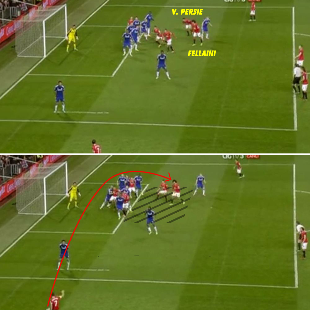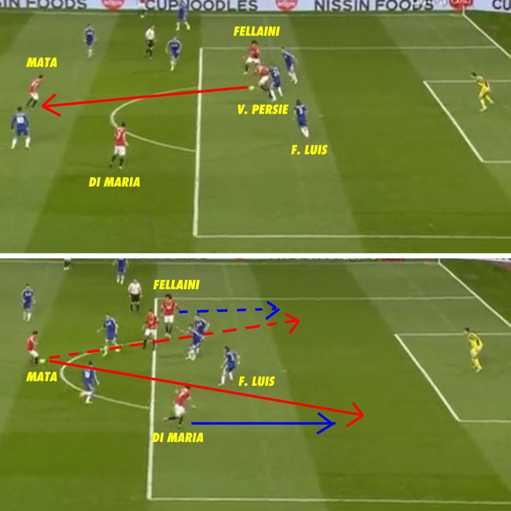Ini memang bukan keputusan yang salah, tetapi United tampil cerdik dengan mencoba untuk maju menahan sebanyak mungkin pemain Chelsea agar tidak bisa menjaga sasaran utama Di Maria di dalam kotak penalti, yaitu si jangkung Fellaini.