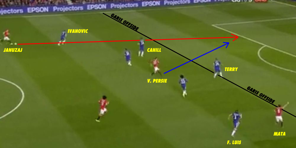 Bola memang diluncurkan oleh Adnan Januzaj kepada van Persie, yang juga tidak terkejar oleh Gary Cahill. Beruntung lagi-lagi Courtois menjadi penyelamat gawang Chelsea.