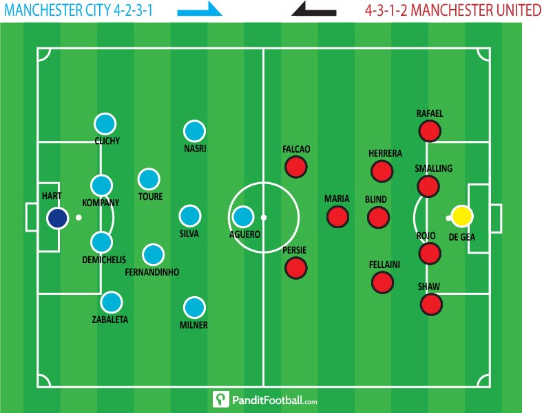 Toure dan Fernandinho difokuskan menjaga pertahanan, sementara David Silva digesert ke tengah menjadi gelandang serang. Melihat strategi ini, Pellegrini kemungkinan akan memanfaatkan kecepatan dan kekuatan para pemainnya untuk mendobrak pertahanan United.