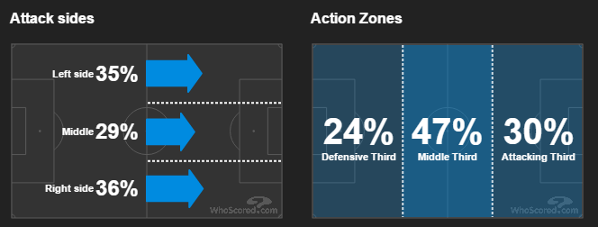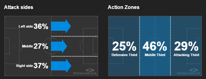 Tidak ada sisi yang menjadi tumpuan utama. Meski United kerap bertumpu pada Angel Di Maria di sisi kiri, tapi malah sisi kanan yang presentase serangannya lebih banyak. Hal ini tak lepas dari sering naiknya Rafael di kanan. Rooney juga kerap bermain melebar ke sisi kanan.