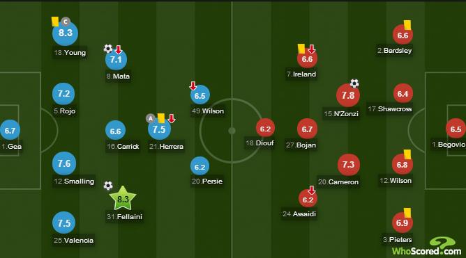 Marouane Fellaini berhasil mencetak gol resmi pertamanya di Old Trafford melalui sundulan kepala, tetapi Steven N'Zonzi sempat membuat Stoke mengimbangi United kembali saat jeda turun minum.