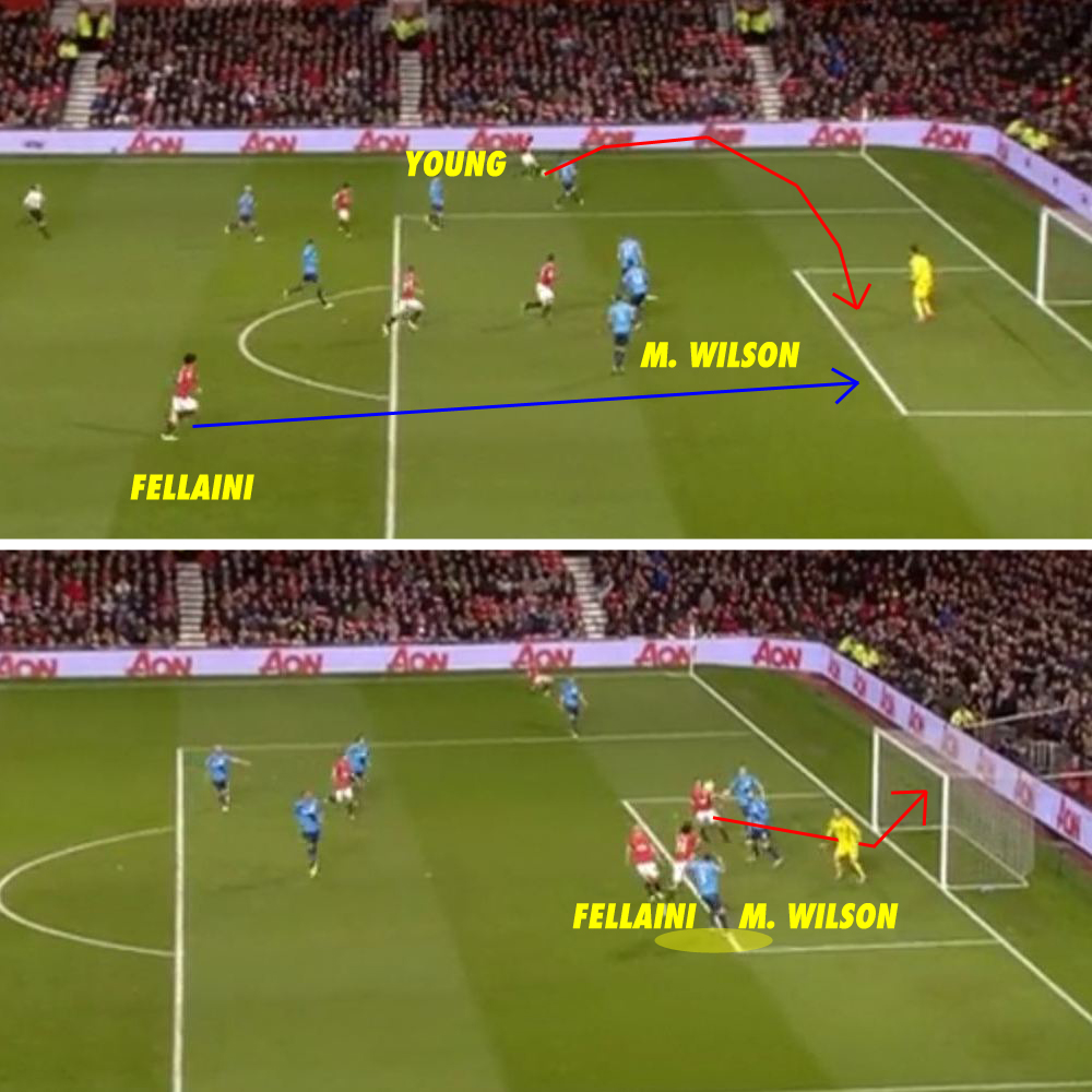 Namun, yang terjadi pada gol pertama Fellaini justru sebaliknya. Seperti yang terlihat pada gambar di bawah ini, tidak ada yang menjaga pergerakan Fellaini. Bahkan ketika umpan berhasil sampai ke depan gawang pun Marc Wilson tidak ikut melompat untuk berduel udara dengan gelandang jangkung asal Belgia tersebut.