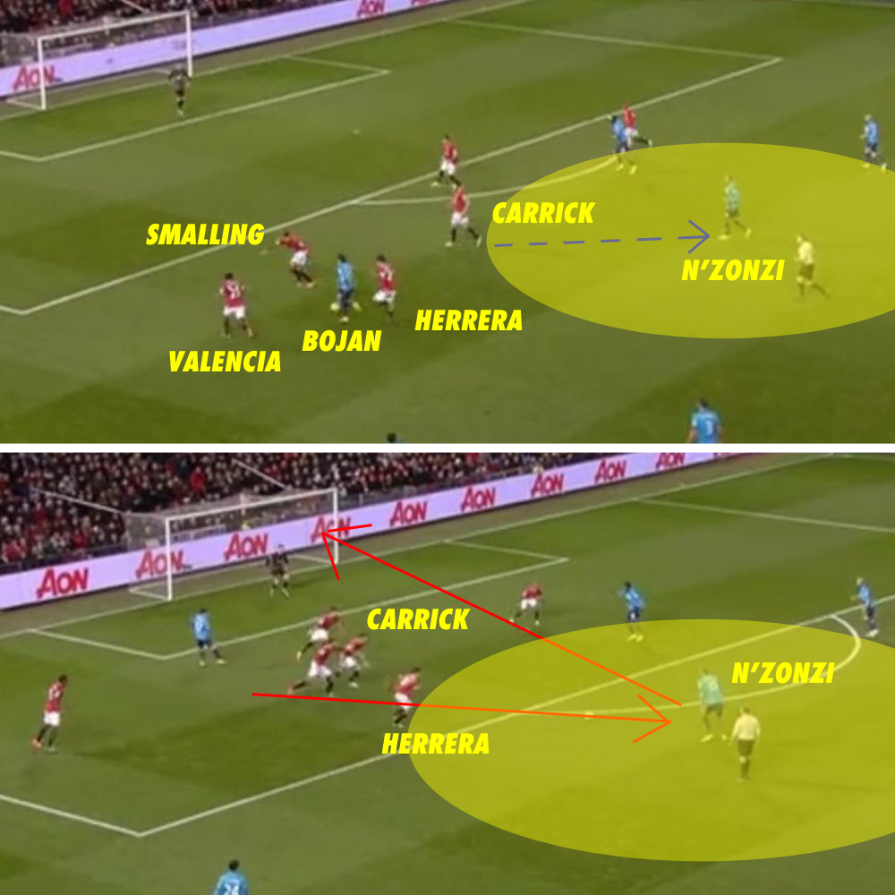 N'Zonzi begitu leluasa sehingga ia sampai punya waktu beberapa saat sebelum ia menembak. Saat sebelum ia menembak, bahkan Carrick sudah berada jauh di belakang. Satu-satunya pemain United yang menyadari bahaya ini dan mencoba menutupnya justru Herrera.