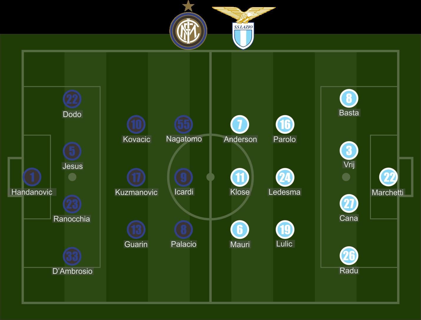 Tiga gelandang tengah Lazio berhasil membuat Inter tak bisa memaksimalkan Mateo Kovacic yang menjadi pengatur serangan Inter. Bermain sebagai pemain no. 10 ketika Mancini mengubah formasinya dari 4-3-3 menjadi 4-3-1-2 sejak pertengahan babak pertama, Kovacic lebih sering mengembalikan bola ke belakang atau mengalirkan bola ke sisi kiri ketimbang mengirimkan umpan langsung ke jantung pertahanan Lazio.