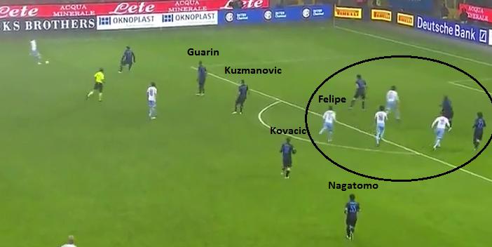 Pada grafis di atas bisa kita lihat bahwa Felipe Anderson lepas dari pengawasan. Guarin-Kuzmanovic-Kovacic berada di area luar kotak penalti sehingga di dalam kotak penalti, terjadi situasi di mana tiga lawan empat.