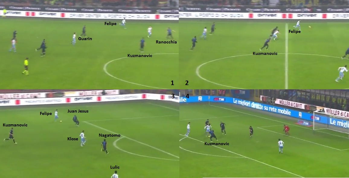 Ranocchia yang kalah duel (gambar 1) mebuat Felipe berada pada posisi bebas untuk menggiring bola. Jika saja Kuzmanovic yang berduel dan kalah, setidaknya Ranocchia masih berada di posnya untuk menghambat pergerakan Felipe sehingga tak terjadi situasi tiga lawan tiga (gambar 3). Pada gambar 4, Kuzmanovic yang kurang tangguh dalam merebut bola pun membuat Felipe melepaskan tembakan yang mengecoh Samir Handanovic.
