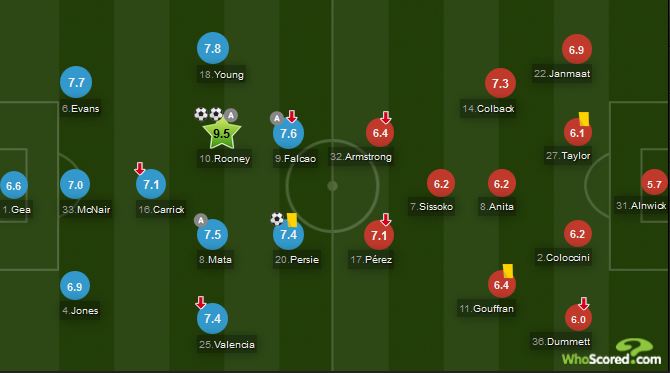 Tidak hanya mencetak dua gol, Rooney menyumbangkan satu assist pada laga ini. Pemain tahun ini memiliki chemistry yang baik dengan Van Persie. Sehingga umpan terobosan Rooney mampu dikonversi dengan baik oleh rekannya pada gol ketiga. Sebenarnya, Rooney bisa saja mencatatkan dua asist andai umpan terobosan yang ia berikan pada Persie di babak pertama gagal berakhir menjadi gol.