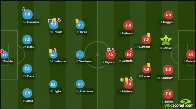 Napoli pun tidak terlalu baik saat menyerang. Hanya saja mereka sukses mencuri gol melalui serangan balik yang cepat dan kesalahan Berisha menghalau tembakan keras Higuain telah menghukum tim ibu kota di depan penontonnya.
