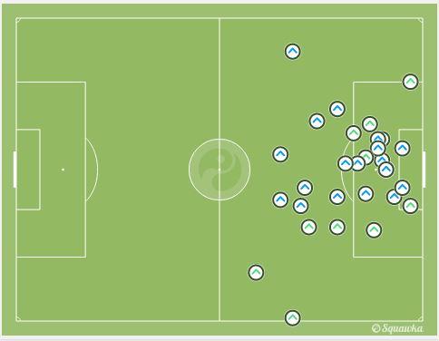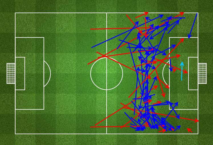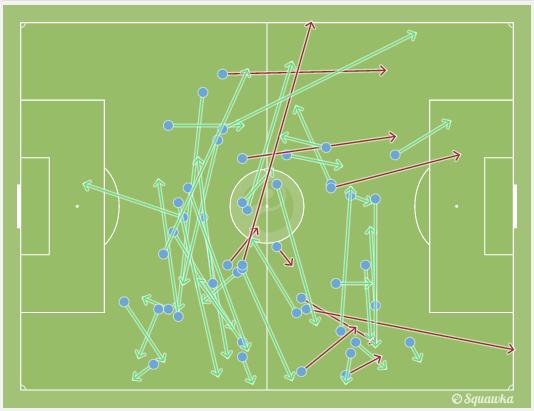Grafis umpan Lazio di bawah ini memperlihatkan bagaimana sulitnya mereka membongkar pertahanan Napoli melalui area tengah pertahanan. Hampir semua serangan Lazio akhirnya dilakukan melalui kedua sisi sayap.