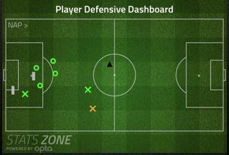 Duet Albiol dan Koulibaly tercatat berhasil menyapu 30 umpan, 4 kali memotong umpan, dan 6 kali memenangkan perebutan bola dari kaki lawan yang dilancarkan pemain-pemain Lazio. Sedangkan Gargano berhasil menyapu umpan 4 umpan (O berwarna hijau), 2 kali menghalang tembakan (berwarna abu-abu), dan sukses 2 kali menghilangkan penguasaan bola dari kaki lawan (X berwarna hijau).
