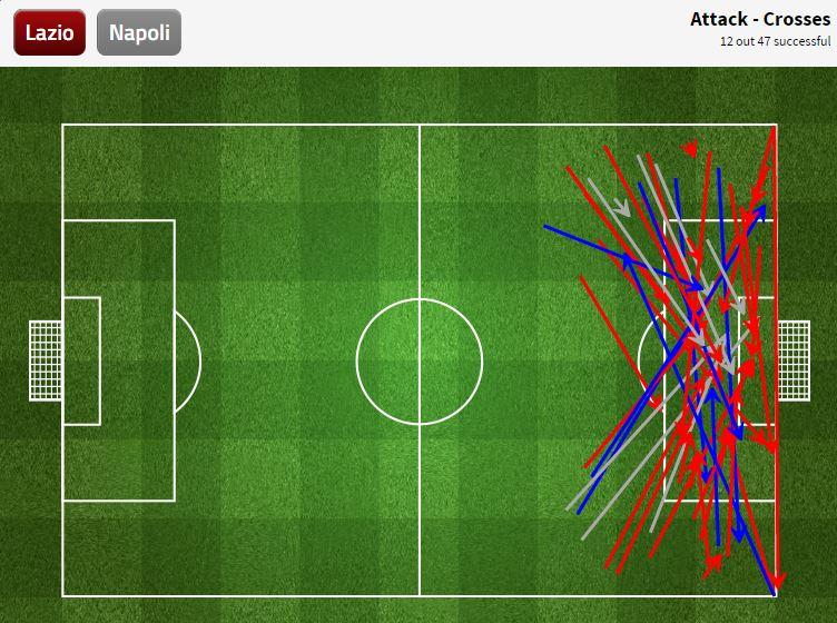 Dari chalkboard tersebut kita bisa melihat bagaimana ekstra kerasnya dua pemain belakang Napoli dalam mengantisipasi umpan silang. Mereka berdua lebih banyak melakukannya di area kotak 16 pas. Candreva dan Keita yang banyak bergerak di masing-masing sisi seperti kehilangan kreativitas. Mereka hanya sibuk mengirim umpan ke kotak penalti tanpa bisa melakukan usaha yang lain.