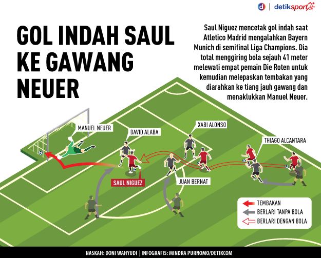 Niguez tahu-tahu saja sudah masuk dalam kotak penalti. Dihadang David Alaba, Niguez sempat membuat gerakan menipu dengan mencondongkan dirinya ke arah kanan namun kemudian bergerak cepat ke kiri dan melepaskan tembakan melengkung rendah yang diarahkan ke tiang jauh gawang Manuel Neuer.