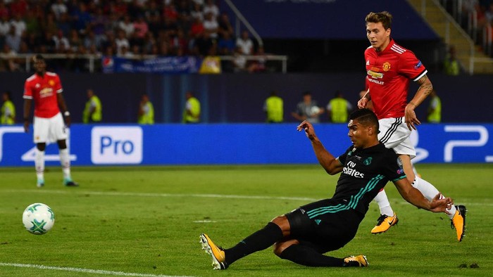 Gol! Madrid memetik keunggulan di menit ke-24. Umpan terobosan Dani Carvajal diterima Casemiro di belakang garis pertahanan MU, dituntaskan dengan sepakan first time ke pojok kanan bawah gawang.