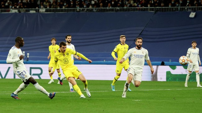 Semenit kemudian giliran Havertz punya kans untuk bikin gol tapi sepakannya membentur Dani Carvajal dan melebar. Dari sana lahir sepak pojok yang dieksekusi Mount dan ditanduk Antonio Ruediger, meski bola melayang.