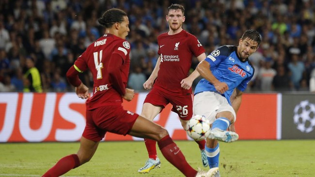 Liverpool dihajar Napoli 1-4 di Stadio Diego Armando Maradona, Kamis (8/9/2022) dini hari WIB, pada Matchday 1 Liga Champions. Tiga gol sudah dicetak tuan rumah pada babak pertama, lewat penalti Piotr Zielinski, Franck Zambo Anguissa, dan Giovanni Simeone.