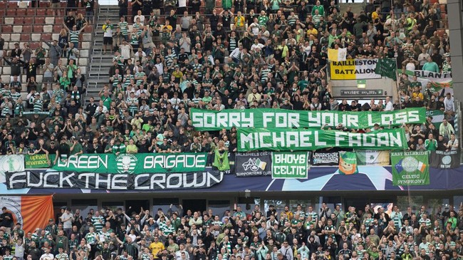 Fans Celtic membawa dua spanduk bertuliskan 'Persetan Kerajaan' dan 'Maaf atas Kehilanganmu Michael Fagan'. Fagan adalah penerobos yang berhasil menyelinap dua kali ke Istana Buckingham dan memasuki kamar Ratu Elizabeth II pada 1982.